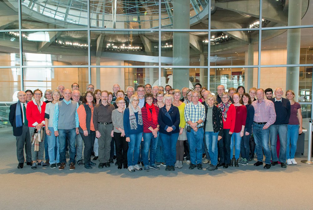 Eine Gruppe von 50 Personen aus dem Wahlkreis folgte vom 25. bis 28. Oktober 2017 der Einladung von Harald Ebner zur politischen Informationsfahrt nach Berlin. Neben dem Besuch des Bundestages stand diesmal ein Treffen beim Bund für Ökologische Lebensmittelwirtschaft (BÖLW) in der Marienstraße in Berlin-Mitte auf dem Programm. Dort erwarteten BÖLW-Geschäftsführer Peter Röhrig und Vertreter weiterer Organisationen die Gäste mit verschiedenen Vorträgen. Die Gäste erfuhren dabei unter anderem spannendes über das Weltacker-Projekt in Berlin-Marzahn anlässlich der Internationalen Gartenausstellung.. Auf der 2000 m² großen Fläche wachsen Ackerkulturen im gleichen Verhältnis, wie sie derzeit auf der Welt angebaut werden. Öffentlichkeitswirksam wurde dort der Frage nachgegangen, wie wir uns in Zukunft ernähren. Unsere globale Ackerfläche reiche, so Haerlin beim anschließenden Gespräch, auch 2050 noch, wenn wir rund 9 Milliarden Menschen sind. Der sorgsame Umgang mit dem Boden und verantwortungsvoller Verbrauch seien jedoch unverzichtbar. Harald Ebner selbst ist Ackerpate des Projektes, das auch 2018 weiter fortgeführt wird. Die Teilnehmer/ -innen besuchten auch das Ministerium für Ernährung und Landwirtschaft, das Deutsch-russische Museum in Berlin-Karlshorst sowie eine Ausstellung über den Alltag in der DDR in der Kulturbrauerei.