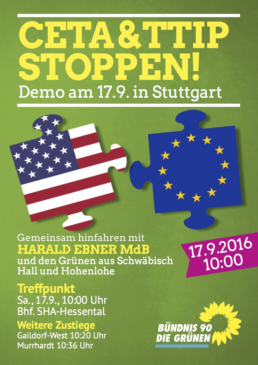 Letztes Jahr im Oktober gingen bei der zentralen Demonstration in Berlin 250.000 Menschen gegen das geplante transatlantische Freihandelsabkommen TTIP auf die Straße. Dieses Jahr sind dezentrale, parallele Demos am Samstag, den 17. September in sieben Großstädten geplant. Die Demo in der Landeshauptstadt Stuttgart beginnt um 12 Uhr auf dem Arnulf-Klett-Platz am Hauptbahnhof. Der örtliche grüne Bundestagsabgeordnete Harald Ebner Mdb und die Grünen Kreisverbände aus den Landkreisen Schwäbisch Hall und Hohenlohe rufen zur gemeinsamen Anreise per Regionalbahn auf.