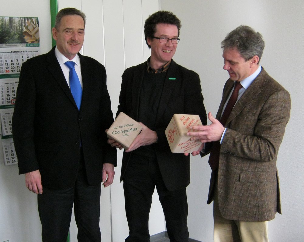 Einig war man sich darin, dass die Rahmenbedingungen für die Verwendung von Holz im Bauwesen verbessert werden müssen und die öffentliche Hand als Bauherr Vorbild sein sollte. Ebner, der Mitglied im Bundestagsausschuss für Ernährung, Landwirtschaft und Verbraucherschutz ist, betonte dabei die Bedeutung ökologischer und nachhaltiger Waldbewirtschaftung auch im Hinblick auf den Klimawandel. Zum Abschluss bekam Harald Ebner das Würfelpaar der Kampagne "Holz pro Klima" überreicht, mit dem Potenziale, aber auch Handlungsfelder rund um dennachwachsenden Rohstoff Holz thematisiert werden.