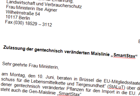 Nach der Veröffentlichung von Untersuchungen unabhängiger Wissenschaftler zu möglichen Langzeit-Risiken von gentechnisch verändertem Mais der Linie Nk603 im September 2012 haben Sie, sehr geehrte Frau Ministerin, gemeinsam mit Ihrem französischen Kollegen eine sorgfältigere Risikoprüfung von gentechnisch veränderten Pflanzen angemahnt. Angesichts der beschriebenen massiven Defizite in der Risikobewertung von „SmartStax“ ist eine Zulassung dieser Maislinie für den Import unverantwortlich. Wir fordern Sie hiermit auf, Ihren Worten nun Taten folgen zu lassen und dafür zu sorgen, dass Deutschland die Zulassung von „SmartStax“ im StALuT ablehnt.
