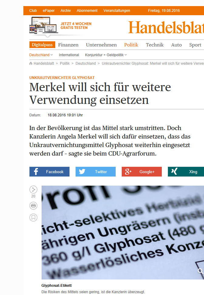 Statt der Agroindustrie nach dem Munde zu reden, sollten die Kanzlerin und ihre Regierung besser Maßnahmen für eine schnelle Verringerung der Glyphosatbelastung von Mensch und Umwelt ergreifen.