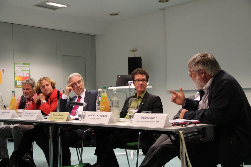 Volker Aust vom Vorstand Pro BürgerbusNRW e.V. berichtete von der Erfolgsschichte der Bürgerbusse in Nordrheinwestfalen. 1985 gestartet, rollten mittlerweile über hundert Bürgerbusse auf den Straßen. Das Konzept basiere auf einem starken, ehrenamtlichen Engagement. Die Bürgerbusse sind dort ausnahmslos als Vereine organisiert und erhalten technische Unterstützung durch die Verkehrsunternehmen. Zum Ausgleich entstehender Verluste bzw. für anstehende Investitionen wie Fahrzeugbeschaffung bedürfe es finanzieller Unterstützung von Land und Kommunen. Er räumte aber auch mit idealisierenden Vorstellungen vom Bürgerbus auf. Das Modell tauge weder als Kostensparmodell noch könne es ganze Linien des ÖPNV ersetzen und es funktioniere nur, wenn ein starkes ehrenamtliches Engagement aus der Bevölkerung herauskomme. Ohne eine Mindestzahl ehrenamtlicher Fahrer sei die Belastung für einzelne Fahrer nicht zu verantworten.