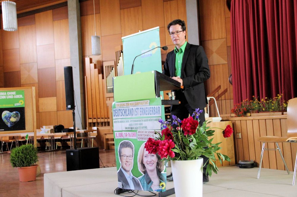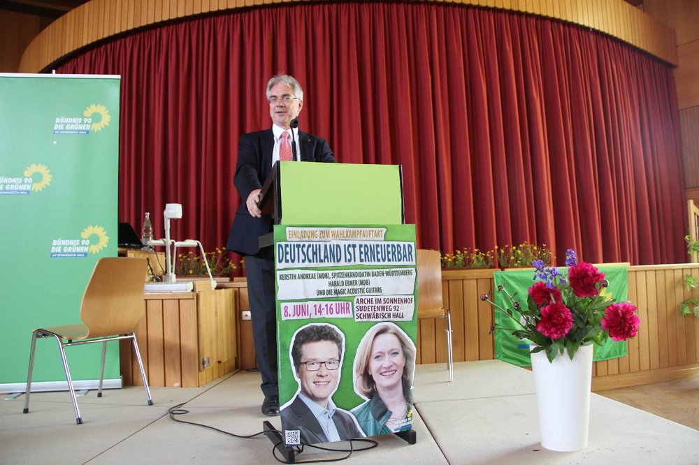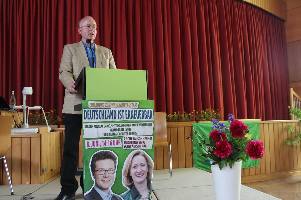 Harald Ebner, Bundestagsabgeordneter für den Wahlkreis Schwäbisch Hall-Hohenlohe und für die Wahl 2013 Direktkandidat im Wahlkreis, konzentrierte sich in seiner Rede auf die Themen, die für die ländlichen Räume wesentlich sind: Landwirtschaft, Verkehr und Infrastruktur. Dabei brachte er das Nichthandeln der schwarz-gelben Bundesregierung auf den Punkt: „Wollen wir Bauernhöfe oder Agrarfabriken? Wollen wir Bienen, Feldlerchen, Kiebitz, Rebhuhn, oder wollen wir einen stummen Frühling? Wollen wir natürliche, hochqualitative Lebensmittel oder Genfood? Wollen wir regionale Öko-Spezialitäten oder Tiefkühlerdbeeren aus China? Wollen wir lebendige ländliche Räume oder verlassene Dörfer und Kleinstädte? Da braucht es Entscheidungen, dafür ist die Politik da – das galt zumindest bis zum Amtsantritt von Frau Merkel.“