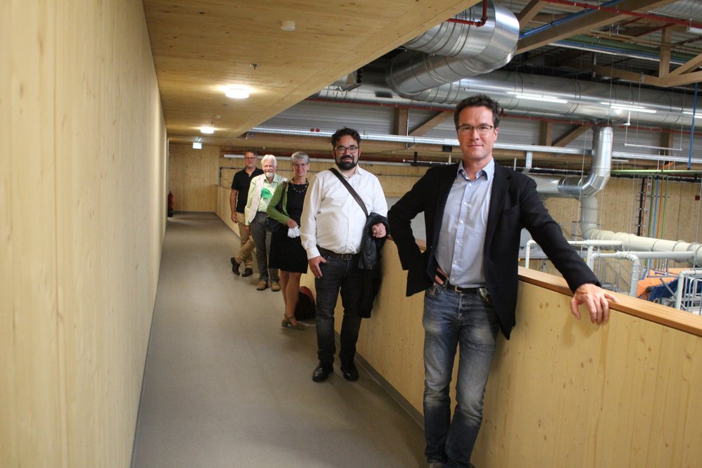 Armin Bauer von SWG erläuterte die technischen Details und die damit verbundene Herausforderungen bei der Umsetzung des 12 800 Quadratmeter umfassenden und fünfschiffig angelegten Baus mit präzise ausgetüftelten Tragwerksverbindungen. Diese sind in der Lage, tonnenschwere Lasten aufnehmen. Zimmermannsmäßige Verbindungen, welche es schon seit Jahrhunderten gibt, wurden dem hochleistungsfähigen Baustoff der Baubuche angepasst. Realisiert hat das Tragwerk das SWG-eigene Ingenieurbüro SWG Engineering. "Baubuche ist ein neuer Baustoff mit neuen technischen Eigenschaften und Parametern, erklärt Bauer. Die SWG wolle als "Leuchtturmprojekt" den Holzbau und Ingenieurholzbau in Zukunft hier am Standort Waldenburg präsentieren, durch Führungen, Ausstellungen, Fort- und Weiterbildung sowie Veranstaltungen. Man müsse in entsprechend qualifizierten Nachwuchs investieren, so Bauer.
