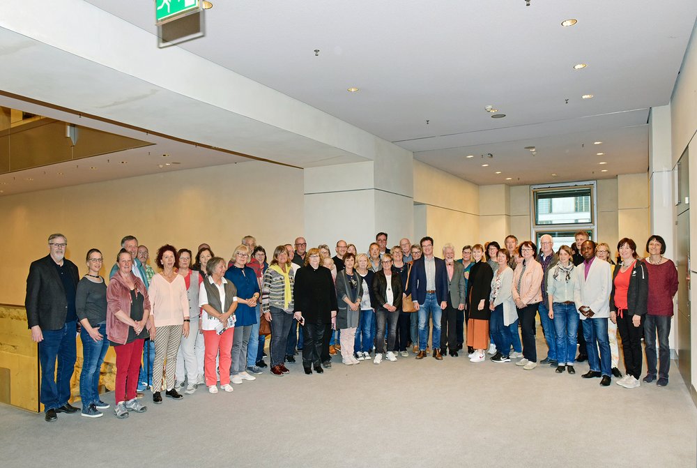 Eine fünfzigköpfige Besuchergruppe reiste vom 3. bis 6. April auf Einladung von Harald Ebner nach Berlin. Gleich nach ihrer Ankunft lernten die Teilnehmenden während einer Führung durch das Berliner Abgeordnetenhaus Interessantes über das Berliner Parlament, dessen Zusammensetzung und aktuelle Themen. Die Gruppe besuchte auch Europas größtes Existenzgründerinnenzentrum, die „Weiberwirtschaft“ in Berlin-Mitte. Geschäftsführerin Dr. Katja von der Bey stellte in einem Vortrag und beim anschließenden Rundgang die erfolgreiche Frauengenossenschaft vor. In der Weiberwirtschaft sind rund 70 Unternehmen, Vereine und Verbände in Frauenhand angesiedelt. Von der Rechtsanwältin bis zur Physiotherapeutin sind verschiedenste Berufsgruppen und daneben einige Initiativen vertreten. „Ein Projekt, das man unbedingt unterstützen sollte“, so eine Teilnehmerin begeistert. Nach ihrem Besuch einer Plenarsitzung im Deutschen Bundestag und einer anschließenden Diskussion mit Harald Ebner konnte die Besuchergruppe noch das abendliche Berlin von der Reichstagskuppel aus betrachten. Weitere Programmpunkte der viertägigen Reise waren eine Stadtrundfahrt, der Besuch der Mauergedenkstätte Bernauer Straße sowie eine angeregte Diskussion über aktuelle Gefährdungen der Demokratie in der Deutschen Gesellschaft in der Voßstraße.
