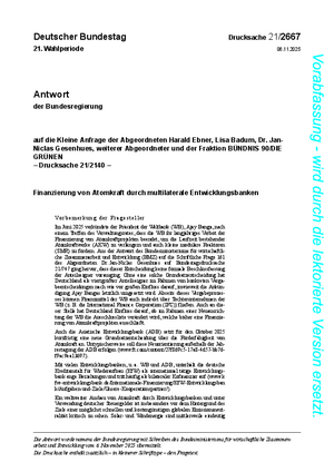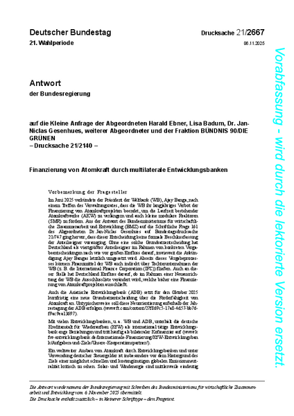 In ihren Antworten auf unsere kleine Anfrage positioniert sich die Bundesregierung in überraschend deutlicher Weise und unter Verweis auf fehlende Wirtschaftlichkeit gegen Atomkraft. Konkret lehnt sie die Förderung von Atomkraft im Rahmen der Entwicklungshilfe durch Entwicklungsbanken mit deutscher Beteiligung ab. Zitat: "In ihrer grundsätzlich ablehnenden Haltung verweist die Bundesregierung insbesondere auf die fehlende Wirtschaftlichkeit von Nuklearenergie." An anderer Stelle weist sie auf die besonderen Sicherheitsrisiken der Technologie hin. Diese Haltung steht im Widerspruch zu den Äußerungen von Wirtschaftsministerin Katharina Reiche aus der vergangenen Woche. Reiche verfolge laut IAEA-Chef Grossi eine sehr ernsthafte Prüfung eines deutschen Wiedereinstiegs in die Atomkraft und möchte Deutschland an der Entwicklung experimenteller Kleinreaktoren (SMR) beteiligen.