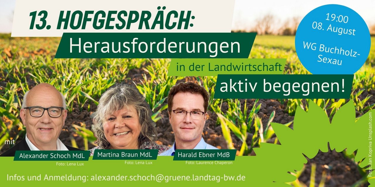 Am 8. August bin ich gemeinsam mit meiner Landtagskollegin Martina Braun beim 13. Hofgespräch von Alexander Schoch (MdL) zu Gast. Unser Thema: Den Herausforderungen in der Landwirtschaft aktiv begegnen!