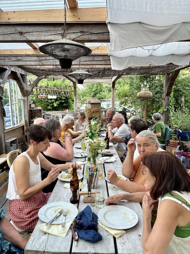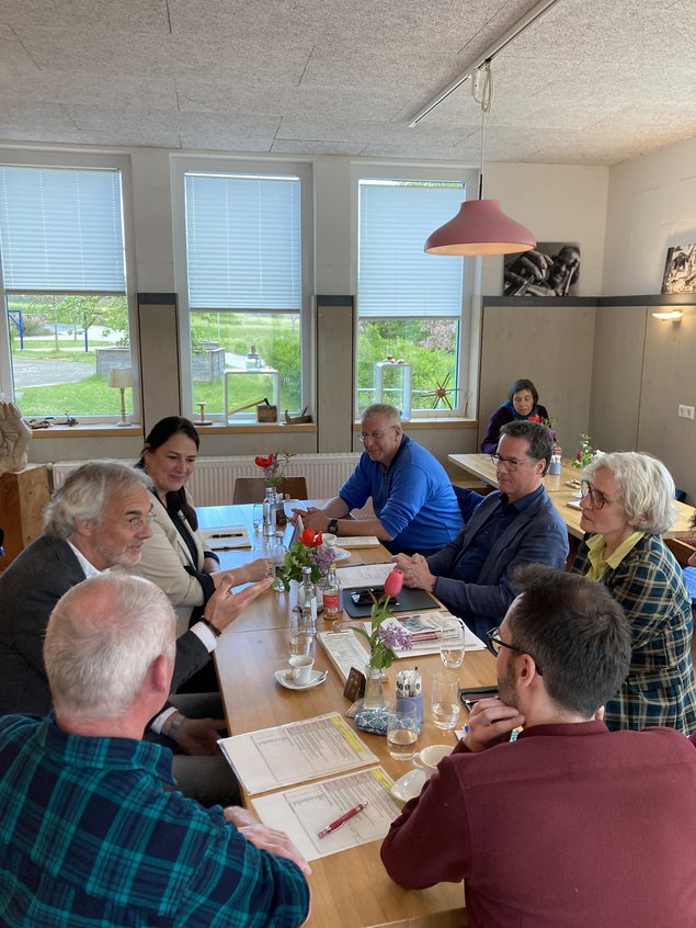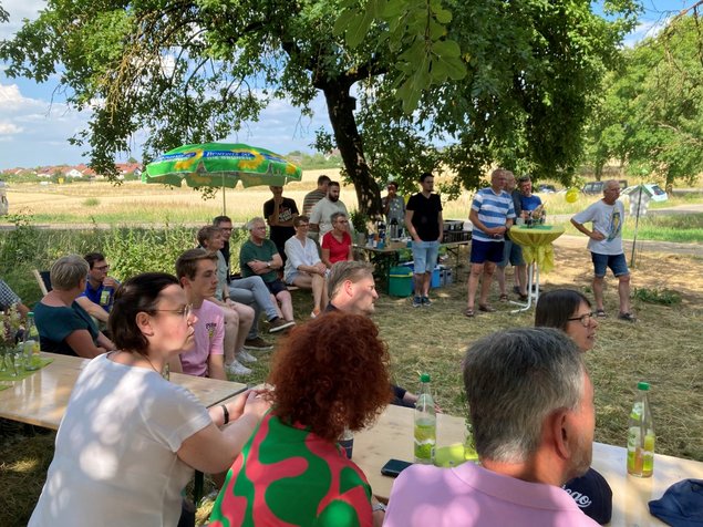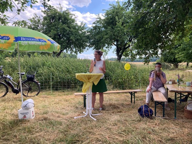 Bestes Wetter, angeregter Austausch, Musik und ein leckeres Menü von Dorle Schmidt, Wilfried Betz und dem Fachwerk-Team. Danke an Lukas Weber vom Landesvorstand, der uns insbesondere berichtete, wie ländliche Flächenkreisverbände vom Landesverband besser unterstützt werden sollen. Danke auch an unsere beiden Kreisvorsitzenden Ruth Steinke und Bettina Lerch für die Organisation und für die Moderation der Besucher*innen-Fragen an Jutta Niemann MdL, Mandatsträger*innen aus Kreistag und Gemeinderat und mich. Viele bewegt nach wie vor der Krieg in der Ukraine und wie die Bundesregierung neben der Lieferung schwerer Waffen aktiv Friedenspolitik betreiben, den Dialog zu anderen Ländern halten und verbessern kann. Im Land, aber auch im Kreis, geht es aktuell vor allem um die konkrete Umsetzung der Energiewende, wie die Ausweisung von Flächen für Freiflächenfotovoltaik, aber auch um langfristige Verbesserungen im öffentlichen Nahverkehr.