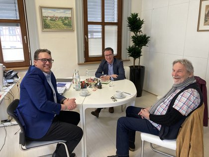 Bei meinem Antrittsbesuch tauschte ich mich im Rathaus Blaufelden mit Bürgermeister Michael Dieterich und dem grünen Kreisrat Hans-Joachim Feuchter (Fraktionsvorsitzender) über aktuelle Entwicklungen in der Gemeinde aus. In Sachen Reaktivierung der Nebenbahnstrecke nach Langenburg ist der Bürgermeister überzeugt, dass die Gemeinde von einer möglichen Realisierung profitiert. Dieterich sieht Potenzial für den Tourismus, aber auch für den Güterverkehr, um örtliche Firmen zu beliefern.