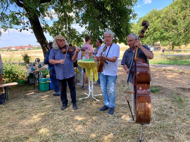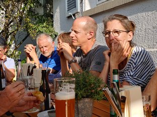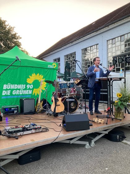Leckere Getränke vom Juze und die Musik der Old City Boys sorgten für gute Stimmung unter den rund 120 Anwesenden beim diesjährigen alternativen grünen Volksfestauftakt in Crailsheim. Über konkrete Stadtthemen informierte Sebastian Karg, Fraktionsvorsitzender im Gemeinderat Crailsheim und Kreistagsmitglied. Unser diesjähriger Hauptredner, Christian Kühn, Parlamentarischer Staatssekretär im Bundesumweltministerium, führte uns vor Augen, was die Ampel gemeinsam schon alles geschafft hat und warum sie besser ist, als ihr Ruf. Die zunehmende Spaltung in der Gesellschaft bereitet Chris und uns Grünen große Sorge. Gerade in Zeiten der Krise und des Wandels, in der unsere Demokratie wie nie zuvor in 70 Jahren von innen und außen bedroht ist, appellierte er an Gesellschaft und Politik, "mehr Einigkeit" zu wagen und dem Populismus abzuschwören. Als kleines Dankeschön für seinen Besuch in Crailsheim gab es ein selbst gebrautes Bier von Tobias Weitbrecht, Beisitzer im grünen Ortsverband in Crailsheim. Nach diesem Katastrophensommer mit erneut verheerenden Waldbränden, extremen Überschwemmungen und vielen Hitzetoten war es mir wichtig, einen Fokus auf die massiven Herausforderungen zu lenken, die uns die Klimakrise aufgibt. Um unseren Wohlstand, unsere Gesundheit und unsere natürlichen Lebensgrundlagen zu bewahren, handeln wir entschieden - z. B. mit dem Sofortprogramm Klimaschutz und dem Ausbau der Erneuerbaren Energien. Mit einem Klimaanpassungsgesetz wappnen wir uns gegen die schon jetzt eingetretenen Gefahren und Folgen der rasanten Erderhitzung und mit der Klimaanpassungsstrategie und der nationalen Wasserstrategie werden wir die Stärkung unserer Ökosysteme weiter voranbringen.