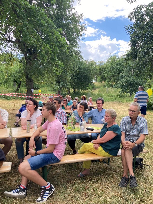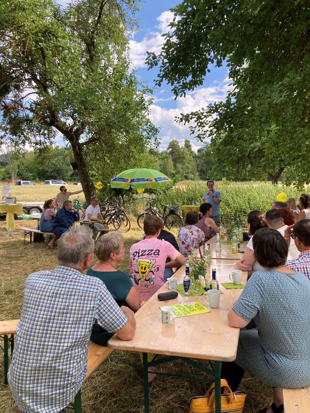 Rund 70 Menschen waren bei wunderbarem Wetter unserer Einladung auf den Riegenhof Mainhardt gefolgt. Allerdings musste das Wahlkampfteam der Grünen Kreisverbände Schwäbisch Hall und Hohenlohe auf Hochtouren daran arbeiten, unseren angekündigten Gast Sarah Wiener kurzfristig per Zoom über Bildschirm zuzuschalten - Dank der GDL ging kein Zug mehr aus der Uckermark zu uns in den Süden.