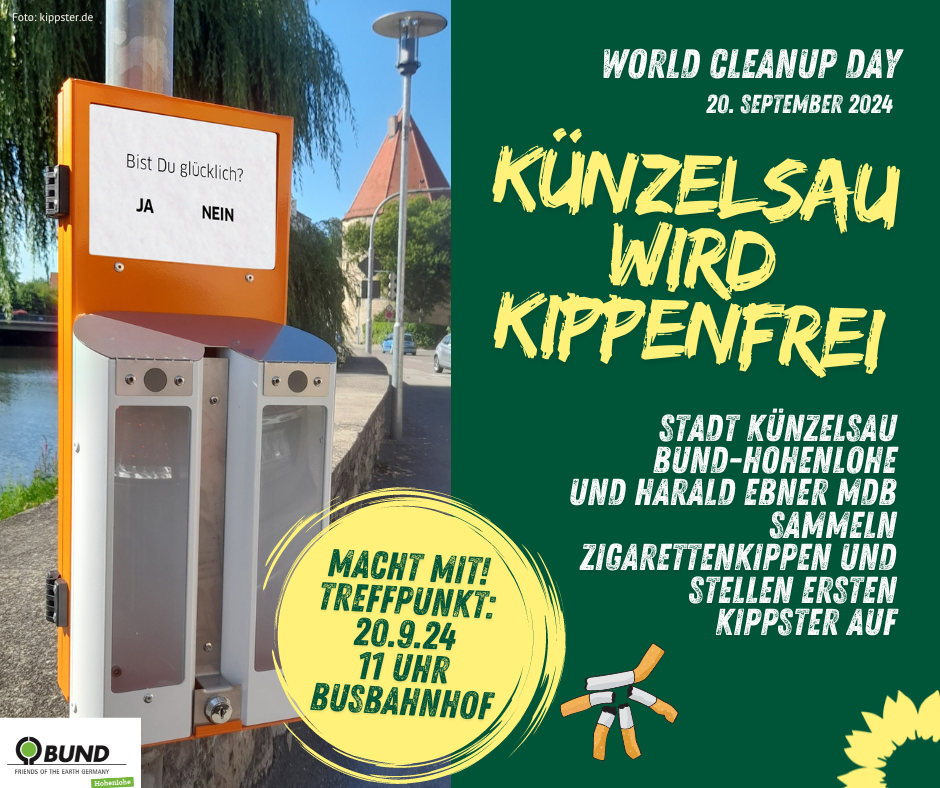Übermorgen, am 20. September 2024, findet der #WorldCleanupDay statt, die größte Bottom-Up-Bürgerbewegung der Welt zur Beseitigung von #Umweltverschmutzung. Die Stadt Künzelsau und BUND-Hohenlohe nutzen diesen Anlass, um erneut Zigarettenkippen einzusamneln und den ersten "Kippster" aufstellen - ein besonderer Abfallbehälter für Kippen. Ich mache auch mit und lade euch herzlich ein, ebenfalls mit dabei zu sein! www.kippster.de